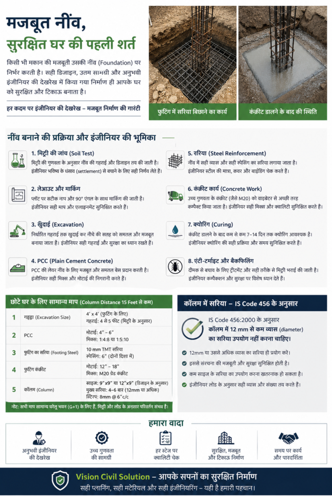 हमारी टीम Vision Civil Solution हर प्रोजेक्ट में सही इंजीनियरिंग और सुरक्षा मानकों का पालन करती है, ताकि आपका घर मजबूत, सुरक्षित और टिकाऊ बन सके।