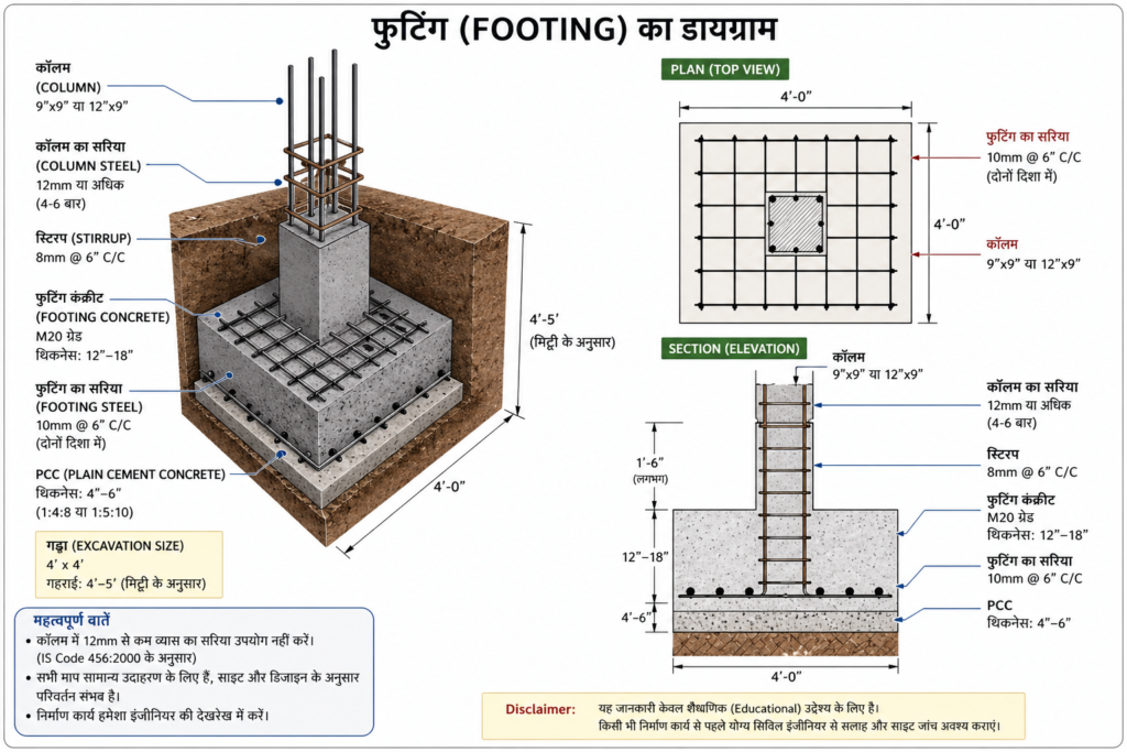 इसमें बताए गए माप (measurements) और तरीके सामान्य निर्माण (general construction) के उदाहरण हैं, जो हर जगह की मिट्टी, लोड और डिजाइन के अनुसार अलग हो सकते हैं।
